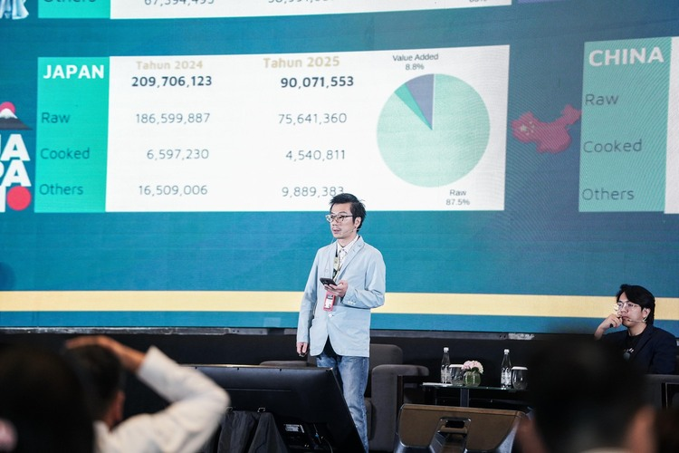 Alfred Herman selaku Vice President dari Bumi Menara Internusa (BMI) turut membuka sesi Seminar kedua FARM 2025. Sebagai pihak eksportir produk udang, ia menjelaskan mengenai daya saing udang Indonesia di pasar internasional.