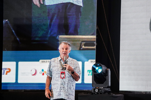 Albert Tacon selaku Shrimp Nutrition Expert dari Suri Tani Pemuka yang menjelaskan materi berjudul “Shrimp Feed Management”.