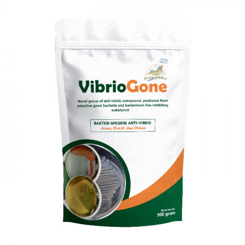 VibrioGone merupakan probiotik tambak udang yang mengandung bakteri Gram positif selektif yang mampu menghasilkan protein aktif bakteriosin antimikroba untuk menekan pertumbuhan bakteri Vibrio spp. di lingkungan tambak.
