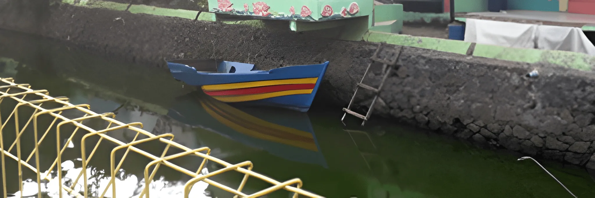 Tidak terlalu jauh dari kolam lele itu, sebuah perahu tertambat di tepi danau buatan di dalam kawasan perumahan. Warnanya biru dengan garis kuning dan merah pada lambungnya. Tampak kontras dengan warna air danau yang kehijauan, tetapi senada dengan warna saung di atasnya.
